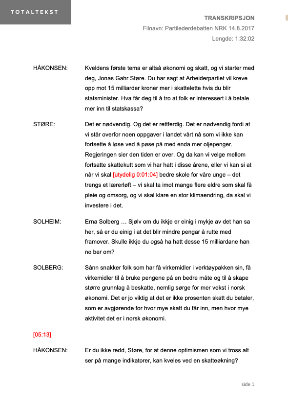 Transkripsjonene leveres i søkbare og redigerbare dokumenter merket med filnavn og opptakslengde.
